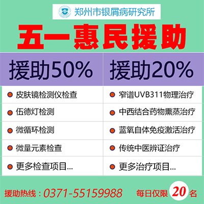 为了解决这一难题,帮助更多银屑病患者接受规范检测与系统治疗。郑州市银屑病研究所于2017年五一小长假期间特开展“五一惠民。银屑病公益援助”活动。4月29日~5月1日,针对所有银屑病初复诊患者给予检查费减免50%、治疗费减免20%的援助。通过检查、治疗双项援助,彻底解决看病贵的难题,真正做到让患者“花钱少,看好病。”